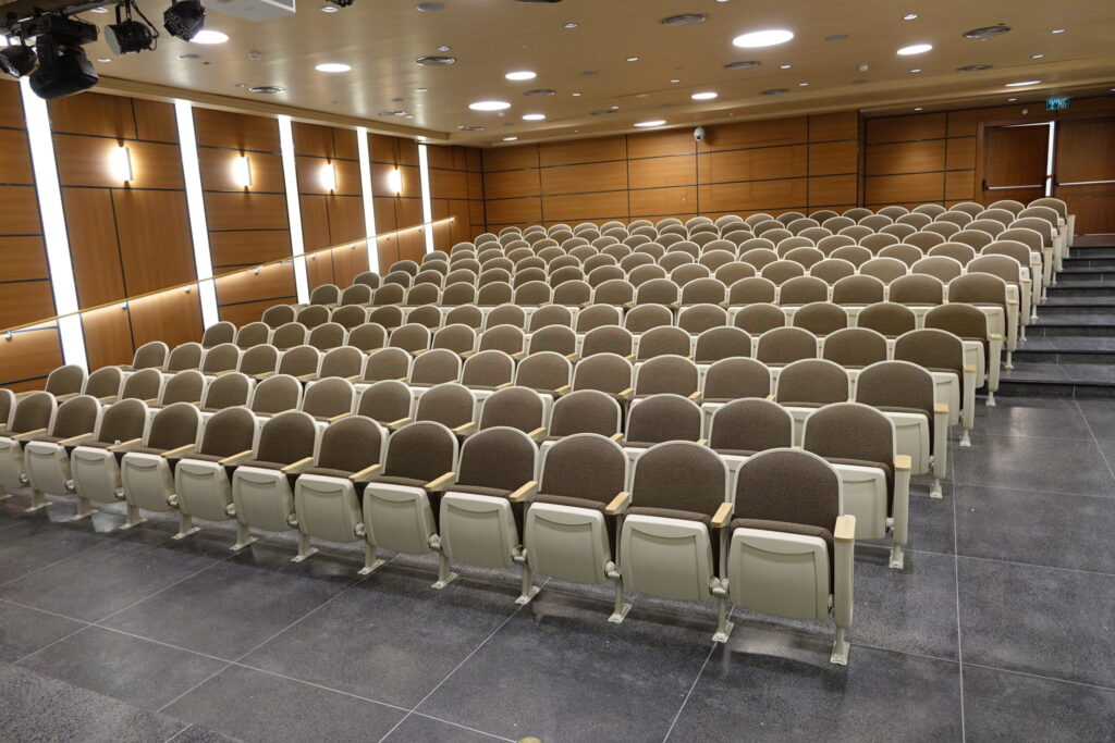 כיסא אודיטוריום המוביל בעולם, חזק, נוח והעמיד מסוגו בקטגוריה , רתום לרום בתוספת משטח כתיבה . כולל בד ריפוד עם 10 שנות אחריות